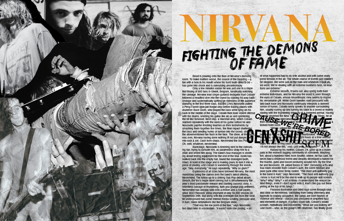 The research I did was one I enjoyed. I had a great time looking for images and inspiration and listened to a lot of new bands while doing research. I wanted to catch authentic images of grunge shows, both big bands and small, the fans, the clothes, the posters to help me get the right mood for these spreads.