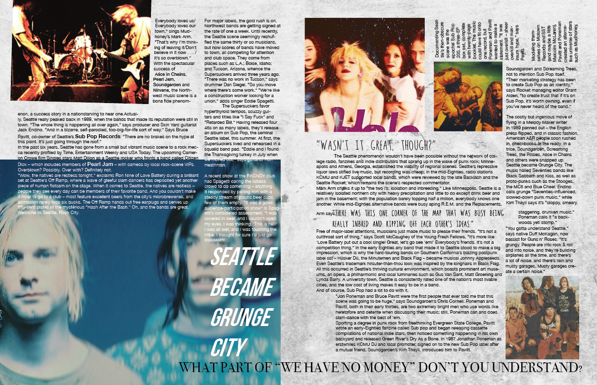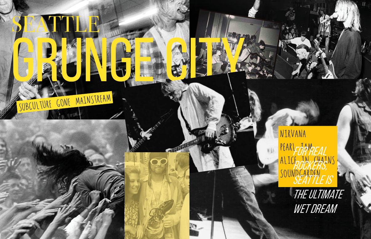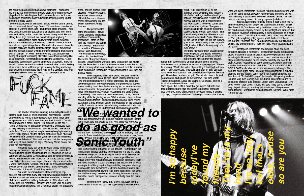 The research I did was one I enjoyed. I had a great time looking for images and inspiration and listened to a lot of new bands while doing research. I wanted to catch authentic images of grunge shows, both big bands and small, the fans, the clothes, the posters to help me get the right mood for these spreads.